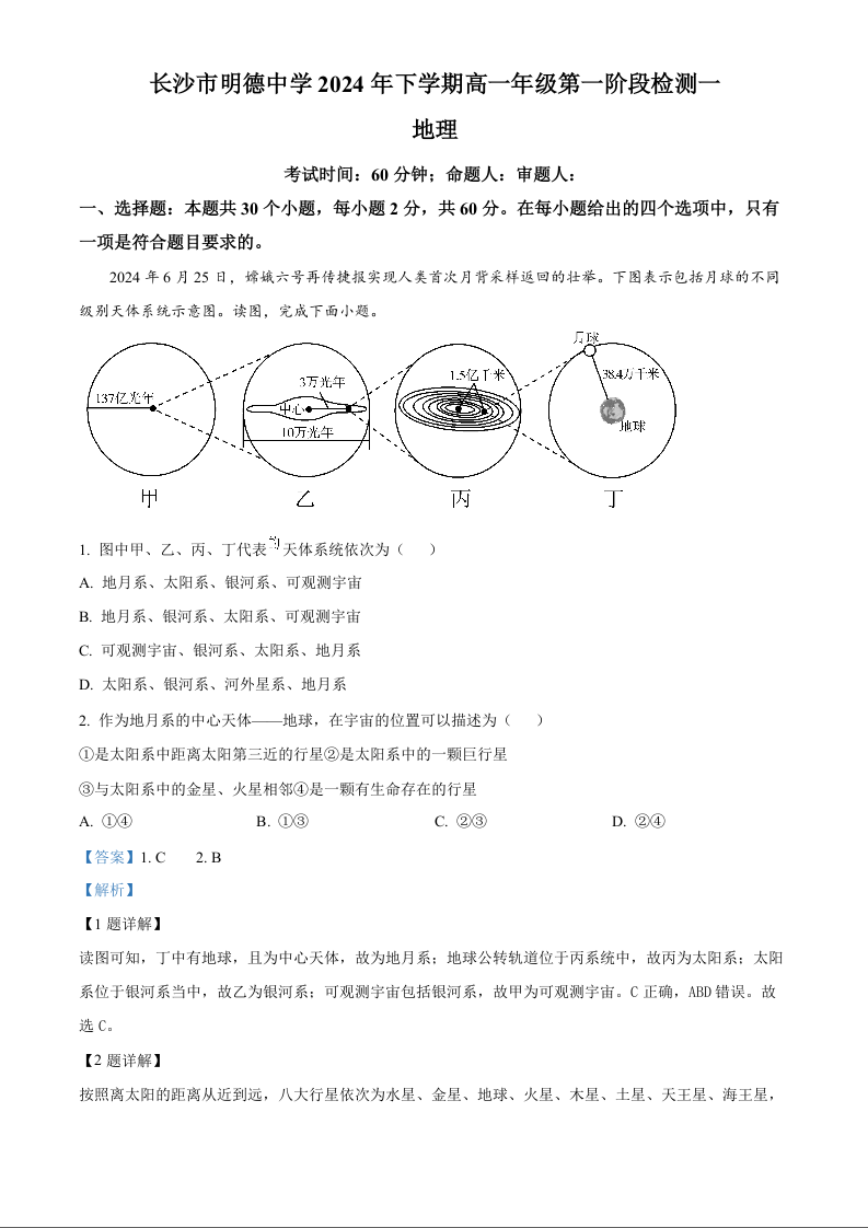 湖南省长沙市明德中学2024-2025学年高一上学期第一次阶段检测 地理