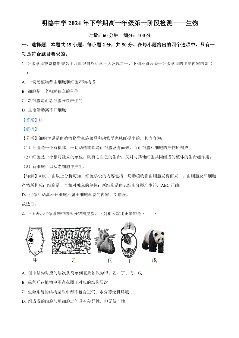 湖南省长沙市明德中学2024-2025学年高一上学期第一次阶段检测 生物