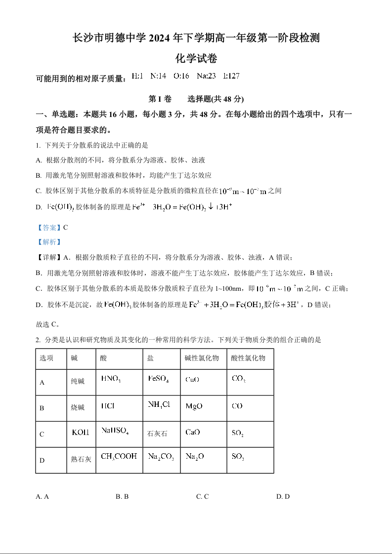 湖南省长沙市明德中学2024-2025学年高一上学期第一次阶段检测 化学