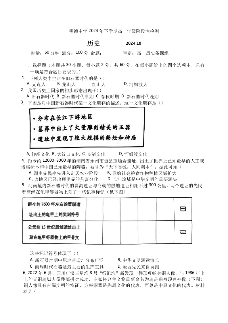 湖南省长沙市明德中学2024-2025学年高一上学期第一次阶段检测 历史