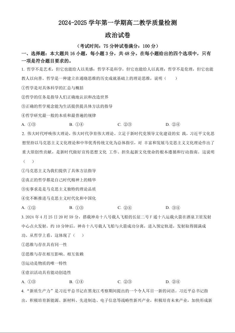 广东省三校2024-2025学年高二上学期第一次质量检测 政治