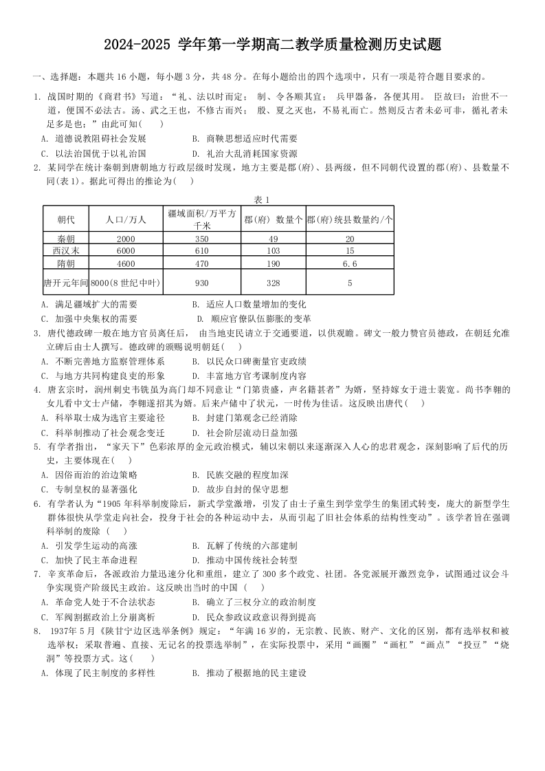 广东省三校2024-2025学年高二上学期第一次质量检测 历史