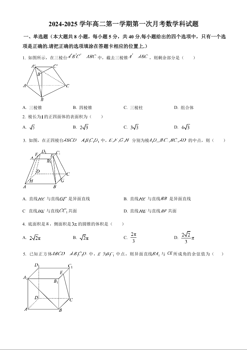 广东省三校2024-2025学年高二上学期第一次质量检测 数学
