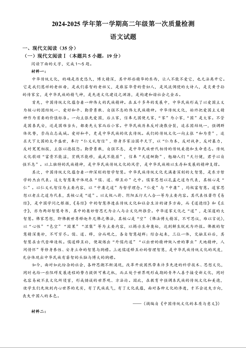 广东省三校2024-2025学年高二上学期第一次质量检测 语文