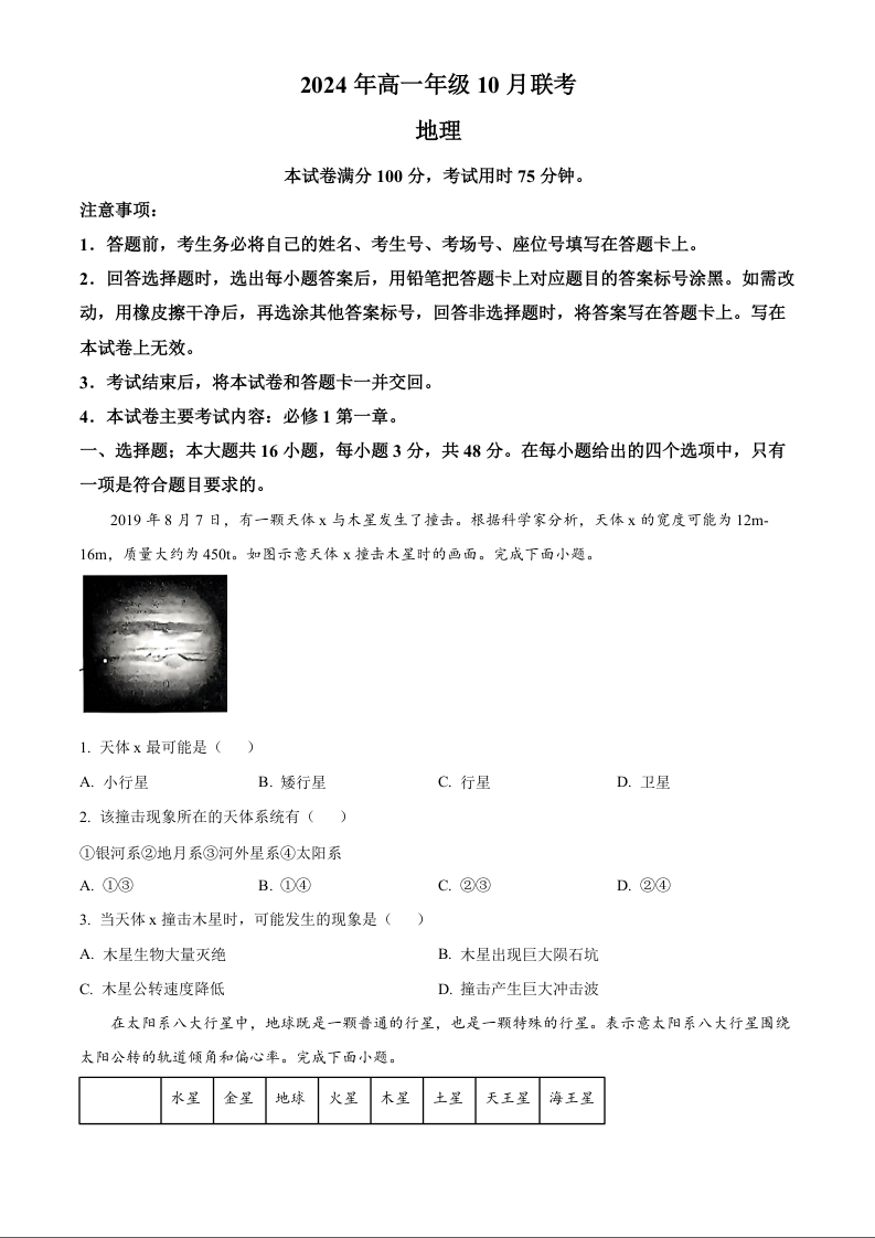 河北省廊坊市2024-2025学年高一上学期10月月考试题 地理