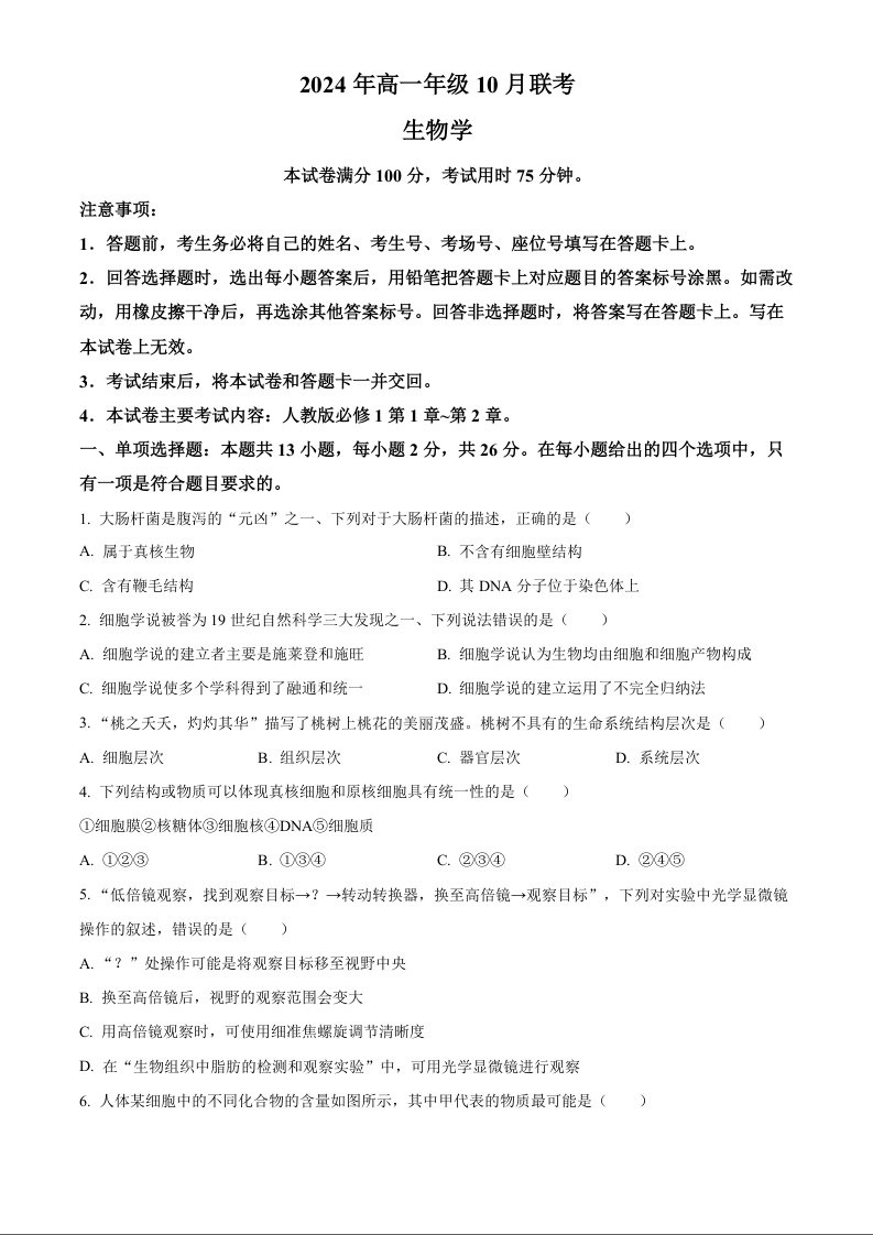 河北省廊坊市2024-2025学年高一上学期10月月考试题 生物