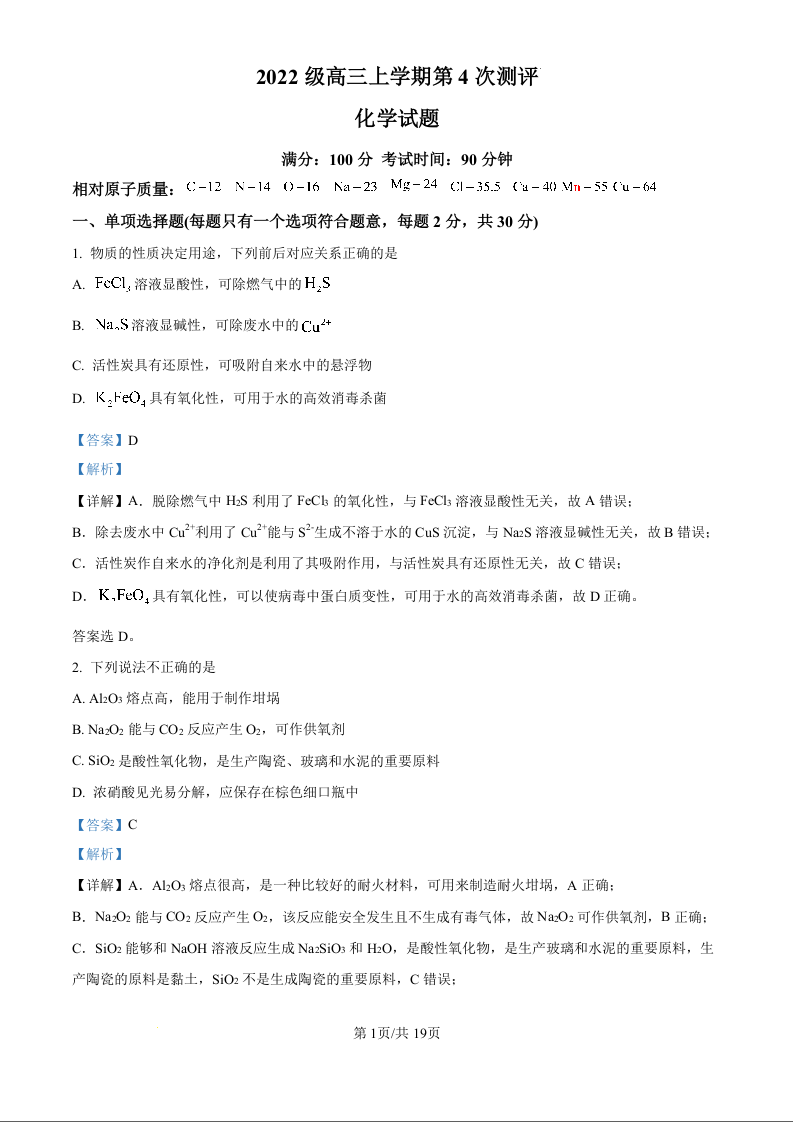 山东省聊城市第二中学2025届高三上学期第一次月考 化学答案