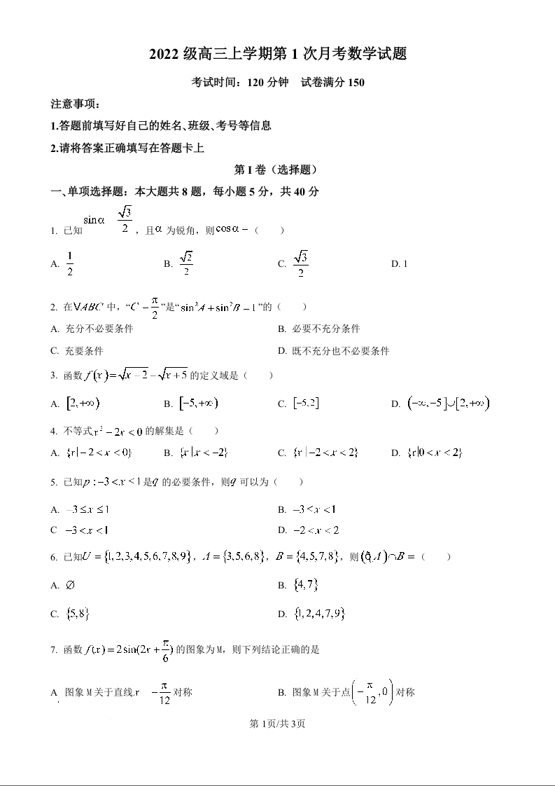 山东省聊城市第二中学2025届高三上学期第一次月考 数学