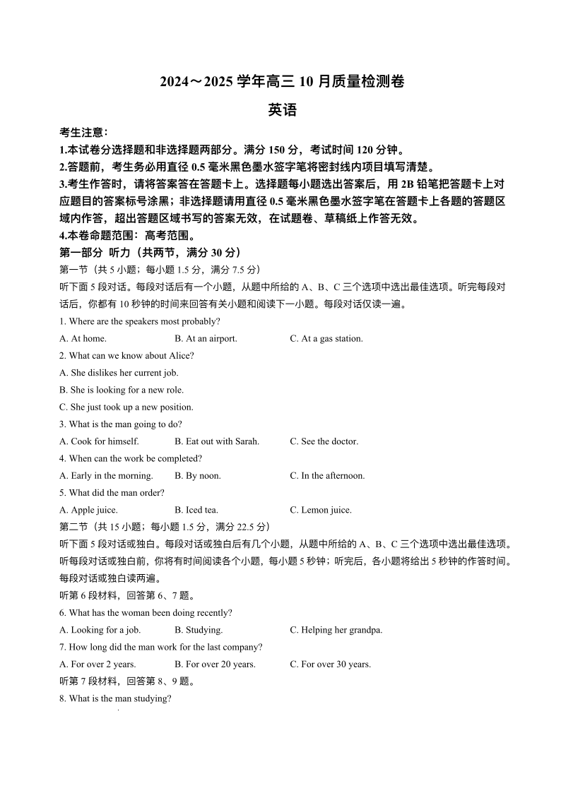 山西省卓越联盟2024-2025学年度高三10月质量检测卷 英语