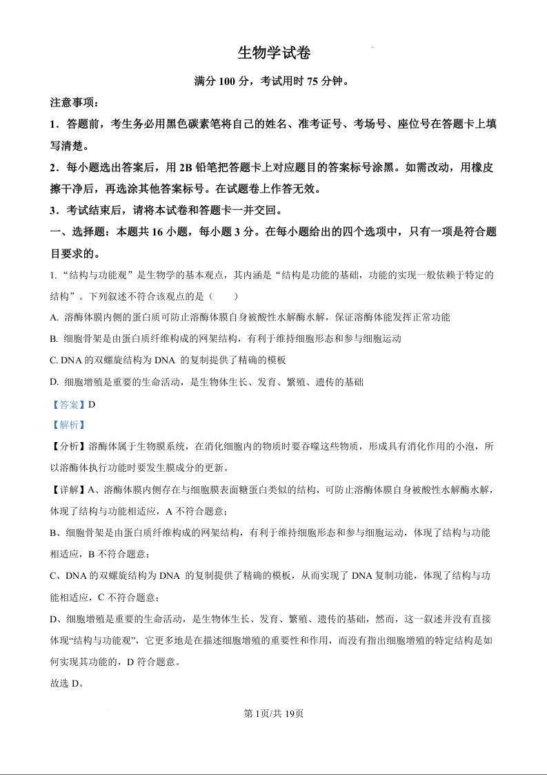 云南师范大学附属中学2025届高三高考适应性月考卷(四)生物答案