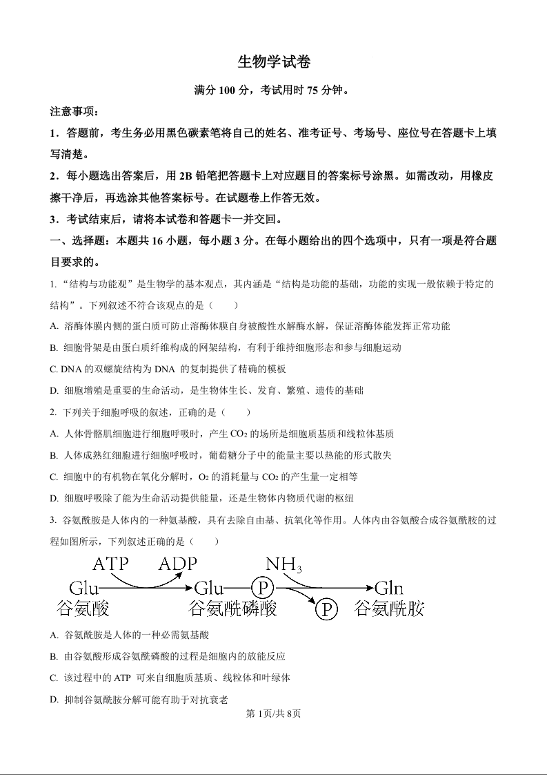 云南师范大学附属中学2025届高三高考适应性月考卷(四)生物