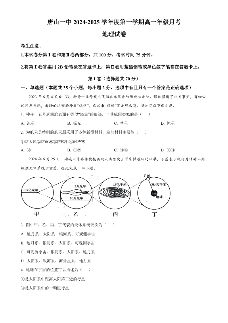 河北省唐山市第一中学2024-2025学年高一上学期10月月考 地理