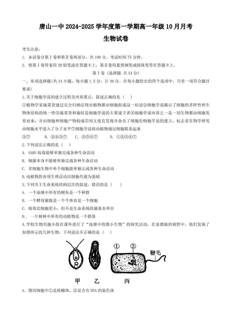 河北省唐山市第一中学2024-2025学年高一上学期10月月考 生物