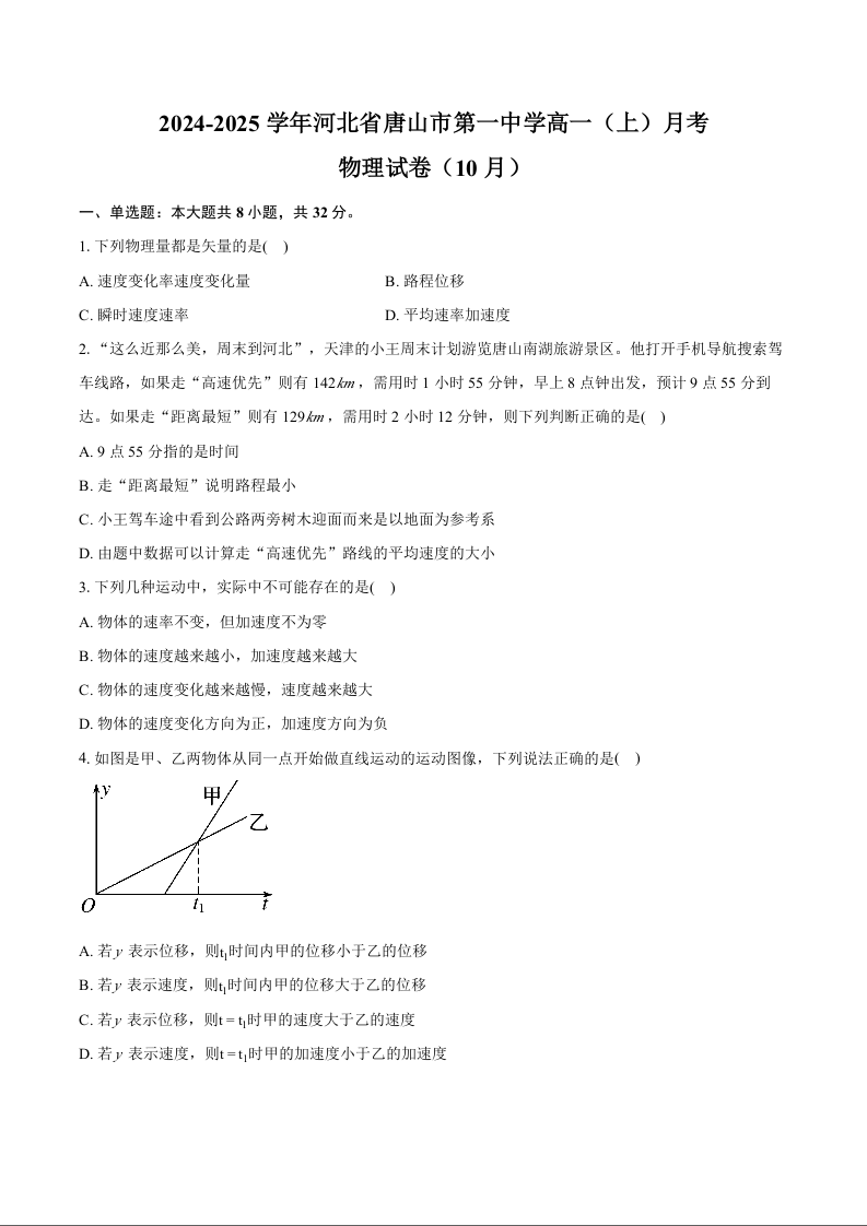 河北省唐山市第一中学2024-2025学年高一上学期10月月考 物理