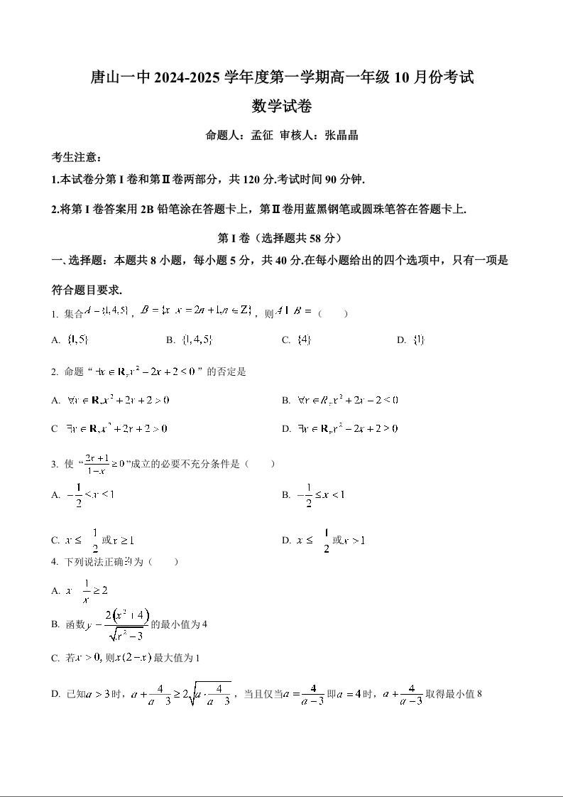 河北省唐山市第一中学2024-2025学年高一上学期10月月考 数学