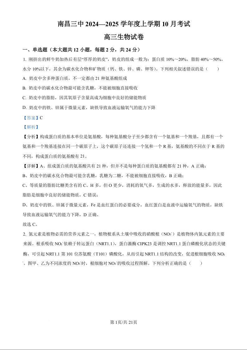 南昌三中2024-2025学年度高三上学期10月考试 生物答案