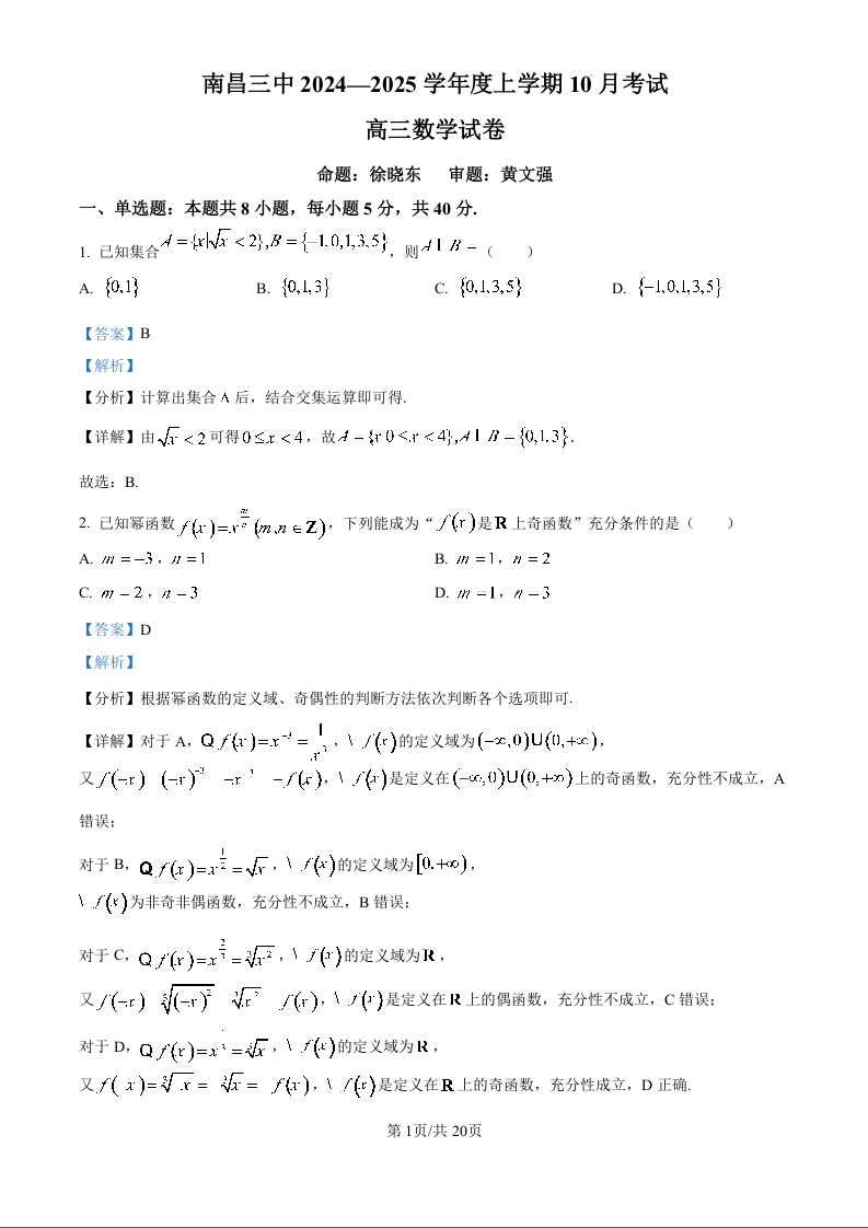 南昌三中2024-2025学年度高三上学期10月考试 数学答案