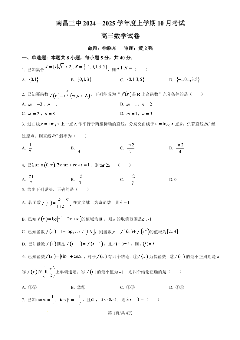 南昌三中2024-2025学年度高三上学期10月考试 数学
