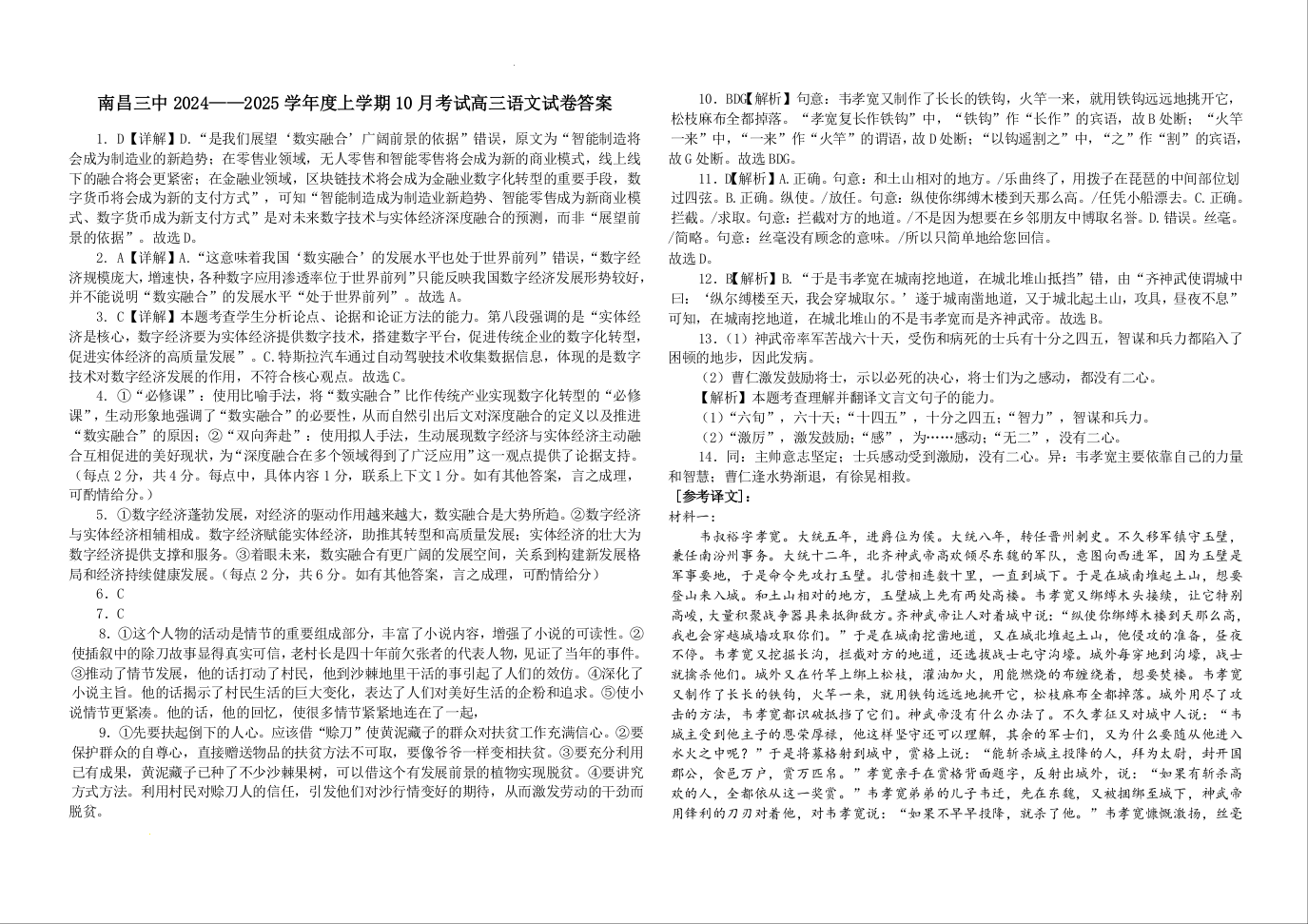 南昌三中2024-2025学年度高三上学期10月考试 语文答案