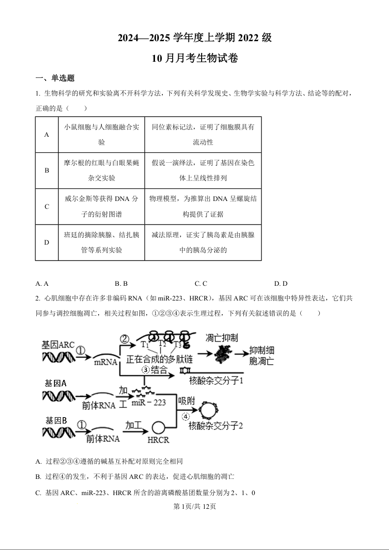 湖北省荆州市沙市中学2025届高三上学期10月月考 生物