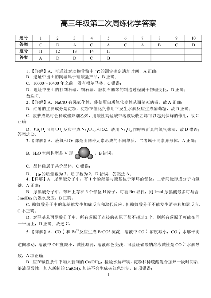 湖北省荆州市沙市中学2025届高三上学期10月月考 化学答案