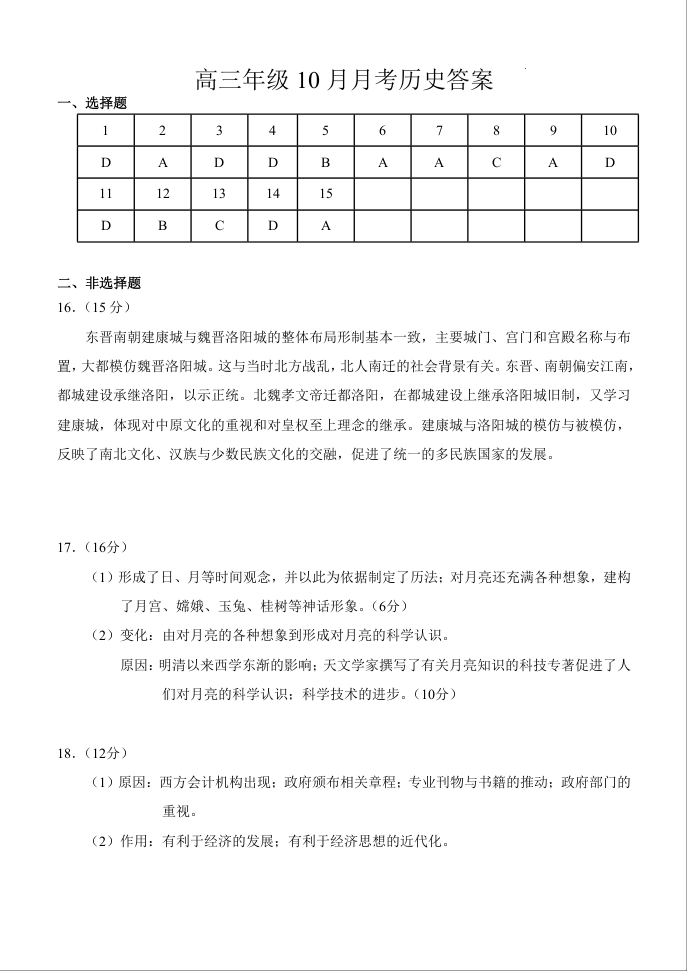 湖北省荆州市沙市中学2025届高三上学期10月月考 历史答案
