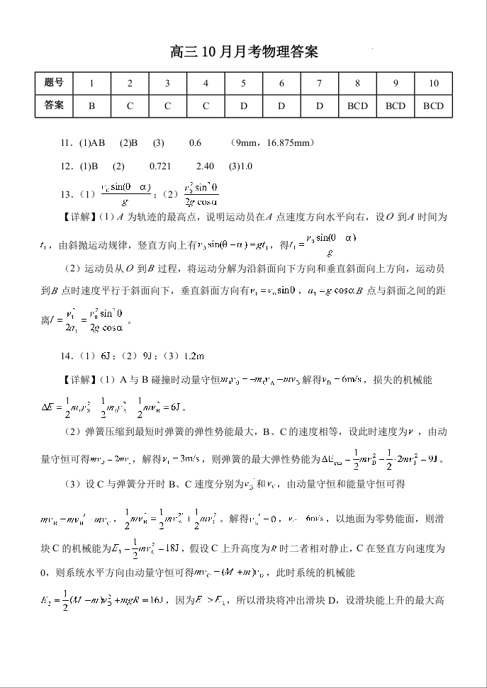 湖北省荆州市沙市中学2025届高三上学期10月月考 物理答案