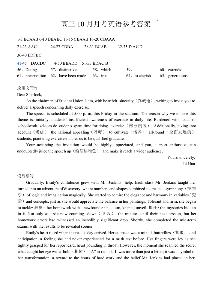 湖北省荆州市沙市中学2025届高三上学期10月月考 英语答案