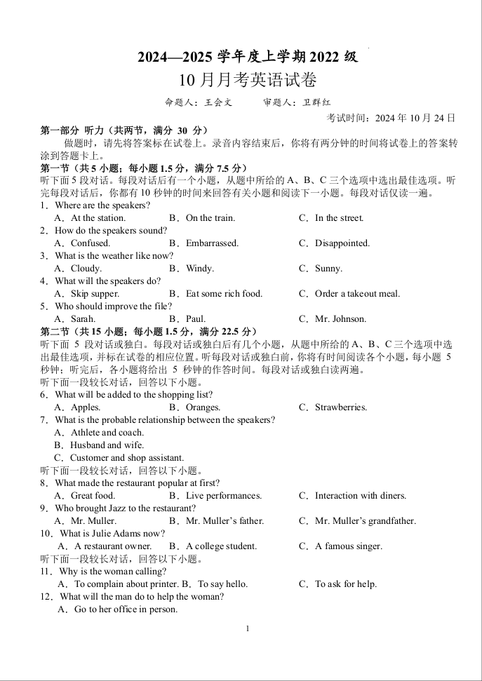 湖北省荆州市沙市中学2025届高三上学期10月月考 英语