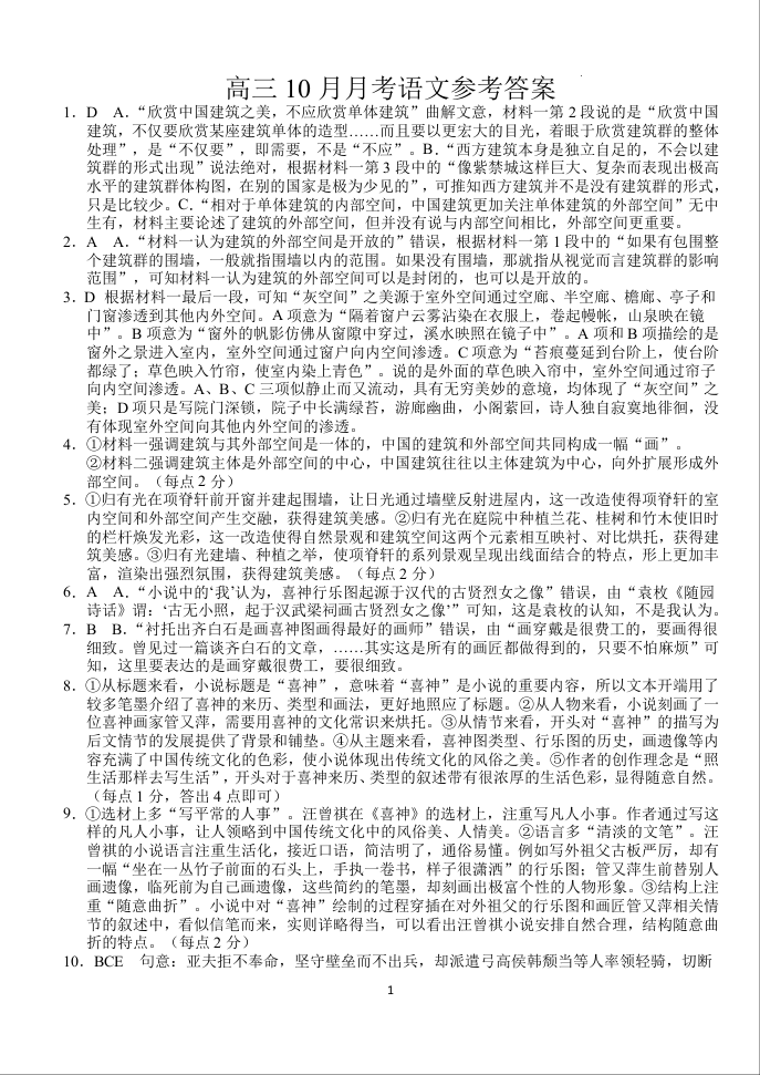 湖北省荆州市沙市中学2025届高三上学期10月月考 语文答案