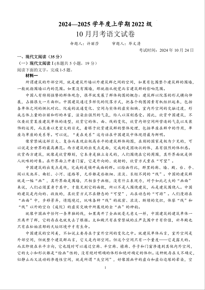 湖北省荆州市沙市中学2025届高三上学期10月月考 语文