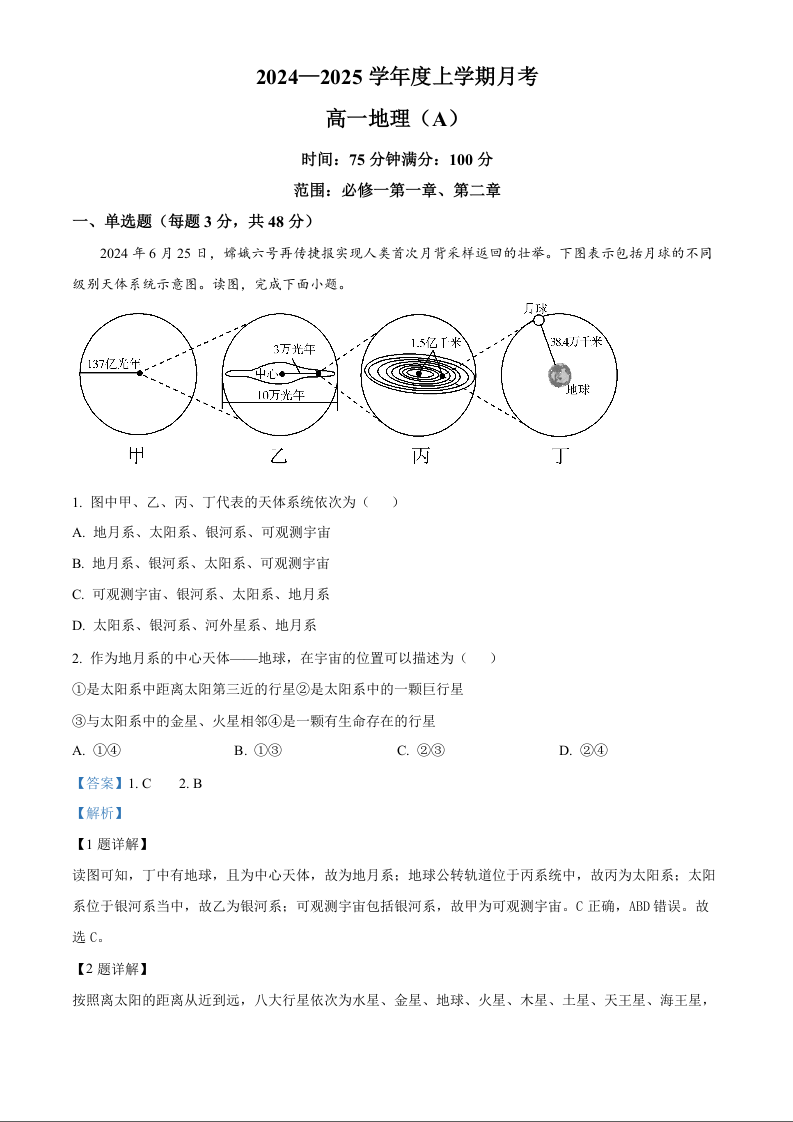 辽宁省辽东南协作体2024-2025学年高一上学期10月月考 地理答案