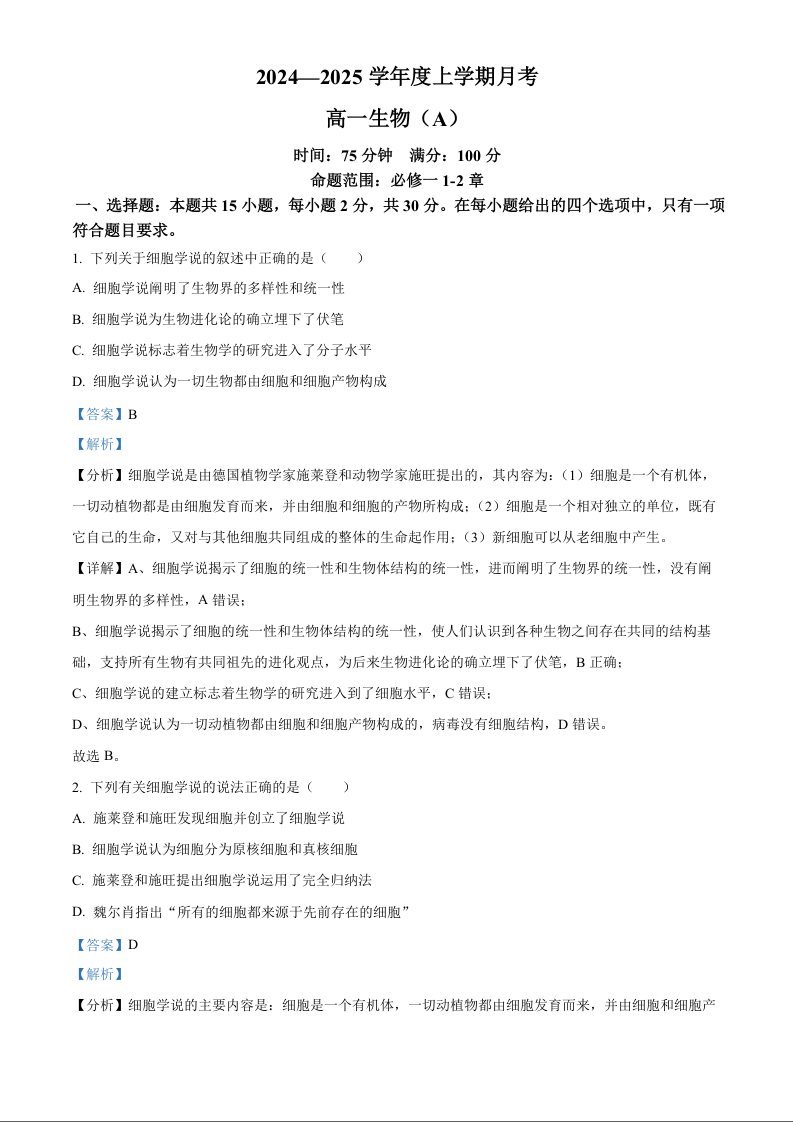 辽宁省辽东南协作体2024-2025学年高一上学期10月月考 生物答案