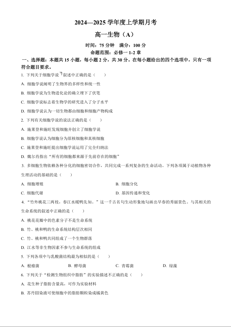 辽宁省辽东南协作体2024-2025学年高一上学期10月月考 生物