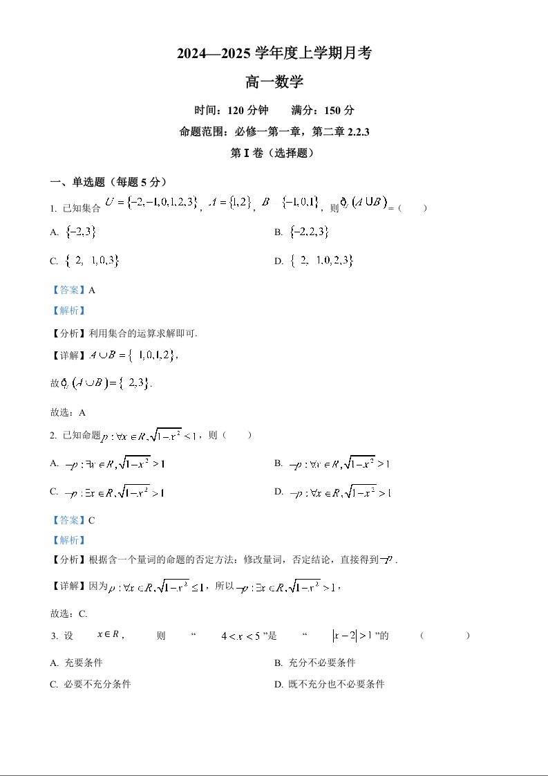 辽宁省辽东南协作体2024-2025学年高一上学期10月月考 数学答案