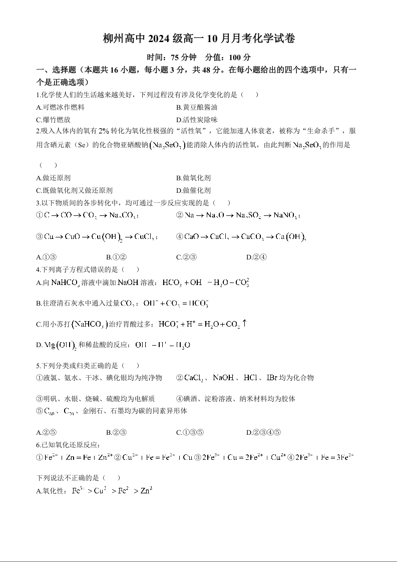 广西柳州高级高中2024-2025学年高一上学期10月月考 化学
