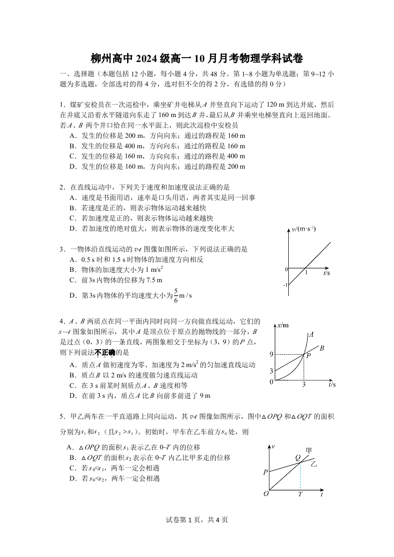 广西柳州高级高中2024-2025学年高一上学期10月月考 物理
