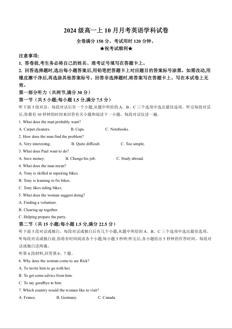 广西柳州高级高中2024-2025学年高一上学期10月月考 英语