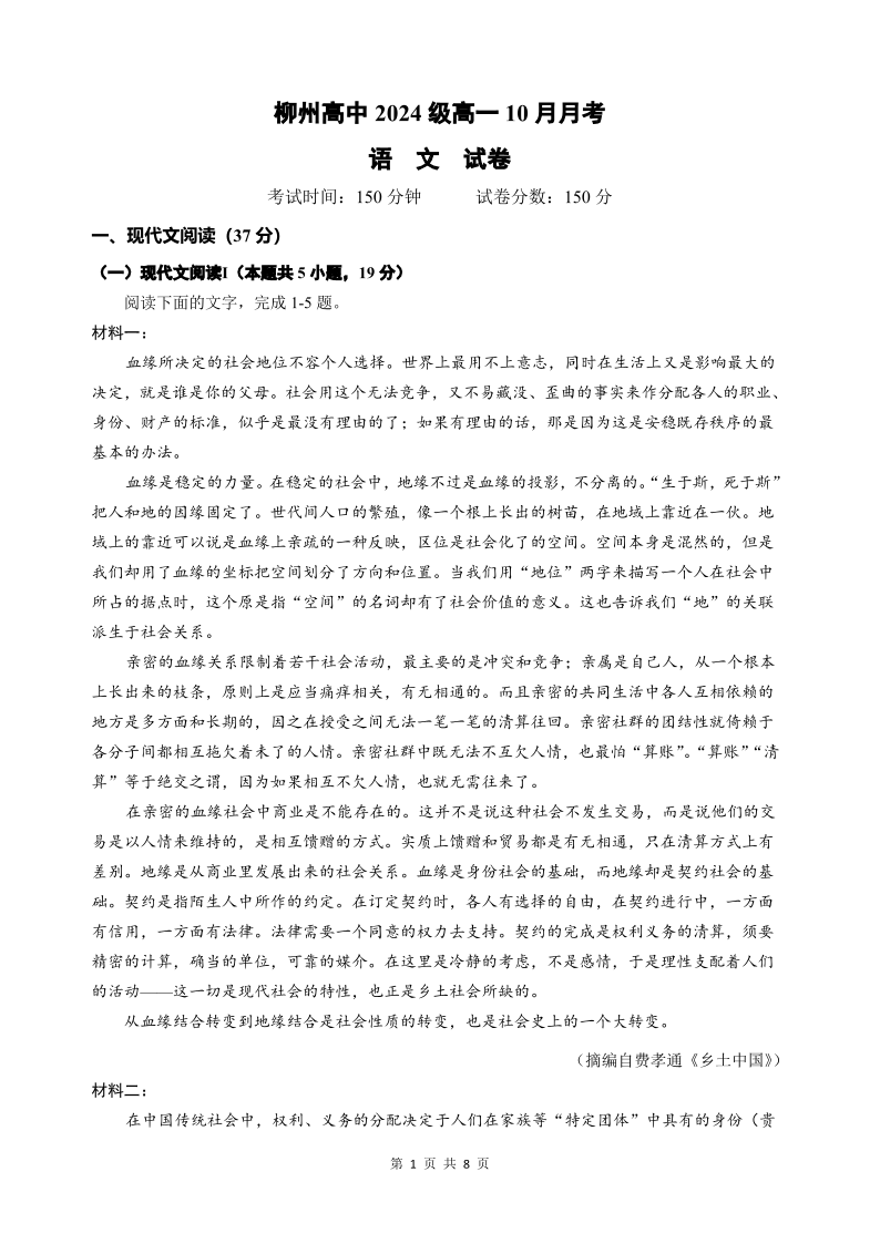 广西柳州高级高中2024-2025学年高一上学期10月月考 语文