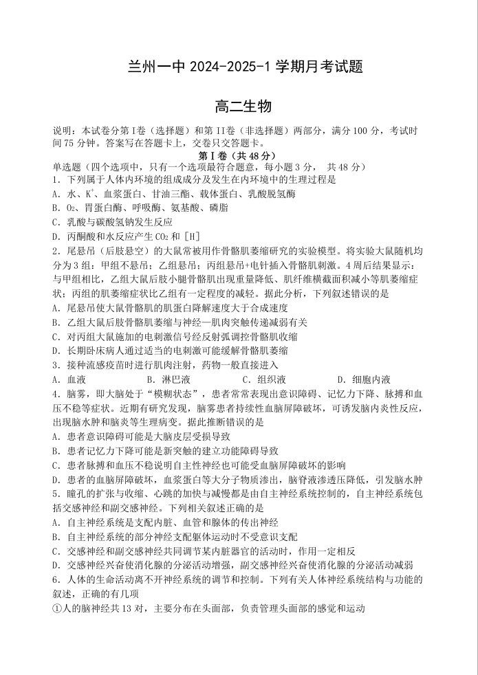 甘肃省兰州第一中学2024-2025学年高二上学期10月月考 生物