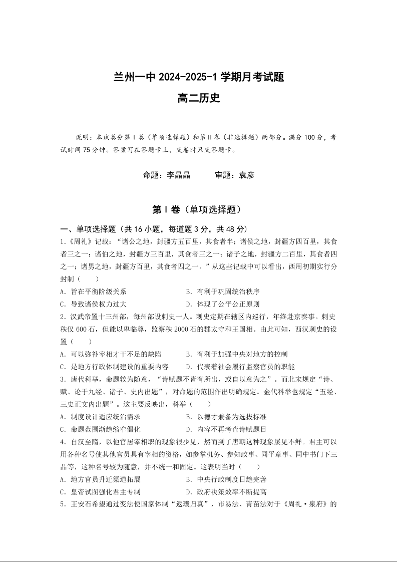 甘肃省兰州第一中学2024-2025学年高二上学期10月月考 历史