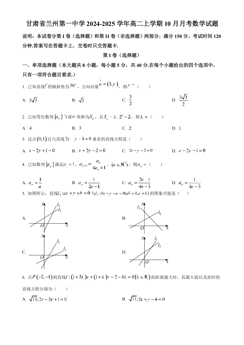甘肃省兰州第一中学2024-2025学年高二上学期10月月考 数学