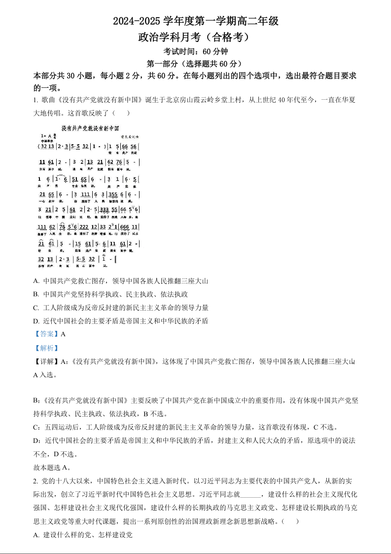 北京理工大学附属中学2024-2025学年度第一学期高二10月月考 政治答案