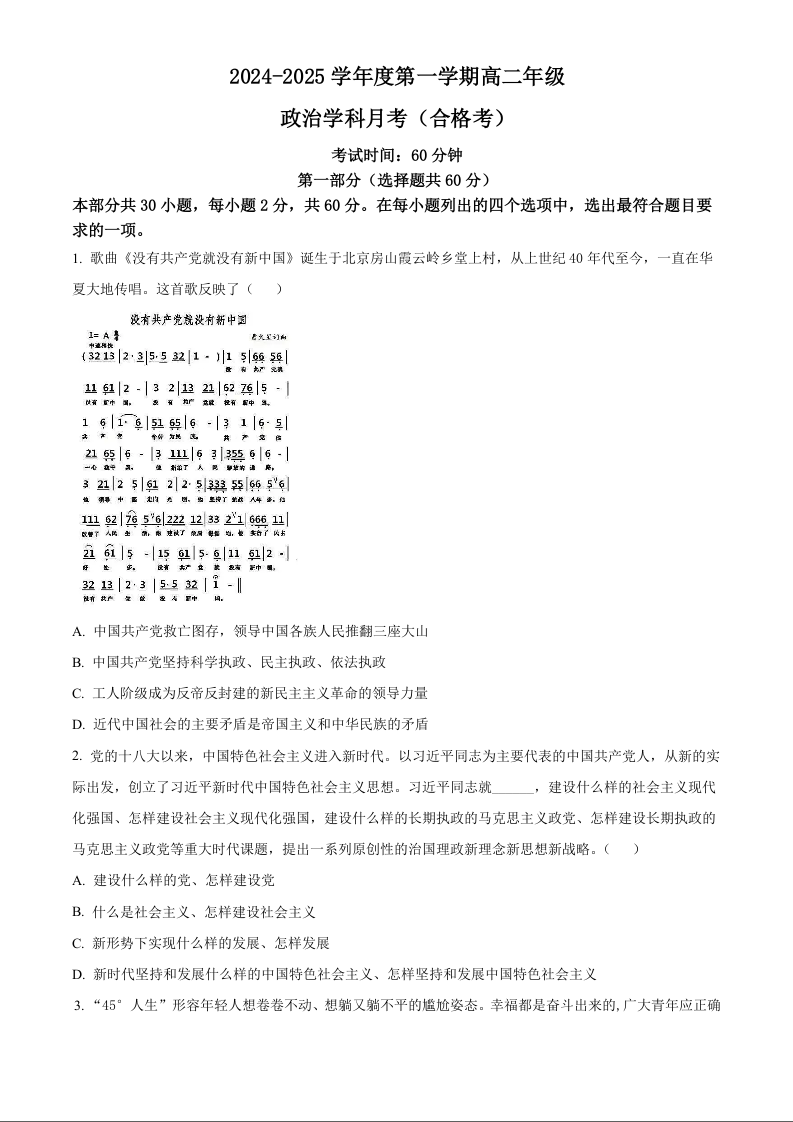 北京理工大学附属中学2024-2025学年度第一学期高二10月月考 政治