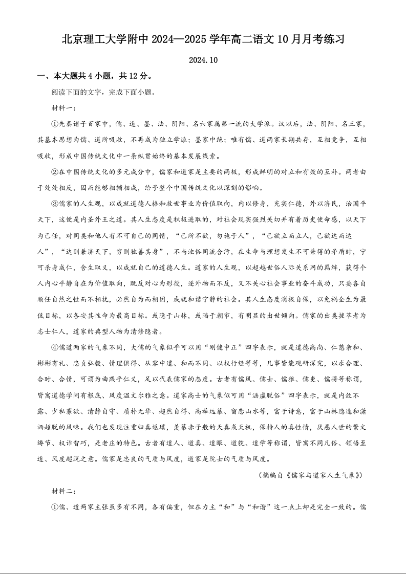 北京理工大学附属中学2024-2025学年度第一学期高二10月月考 语文