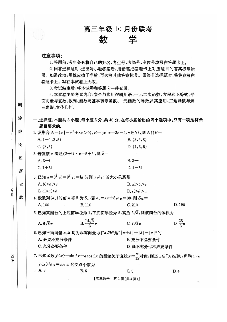 河北省邢台市邢襄联盟2025届高三10月联考 数学