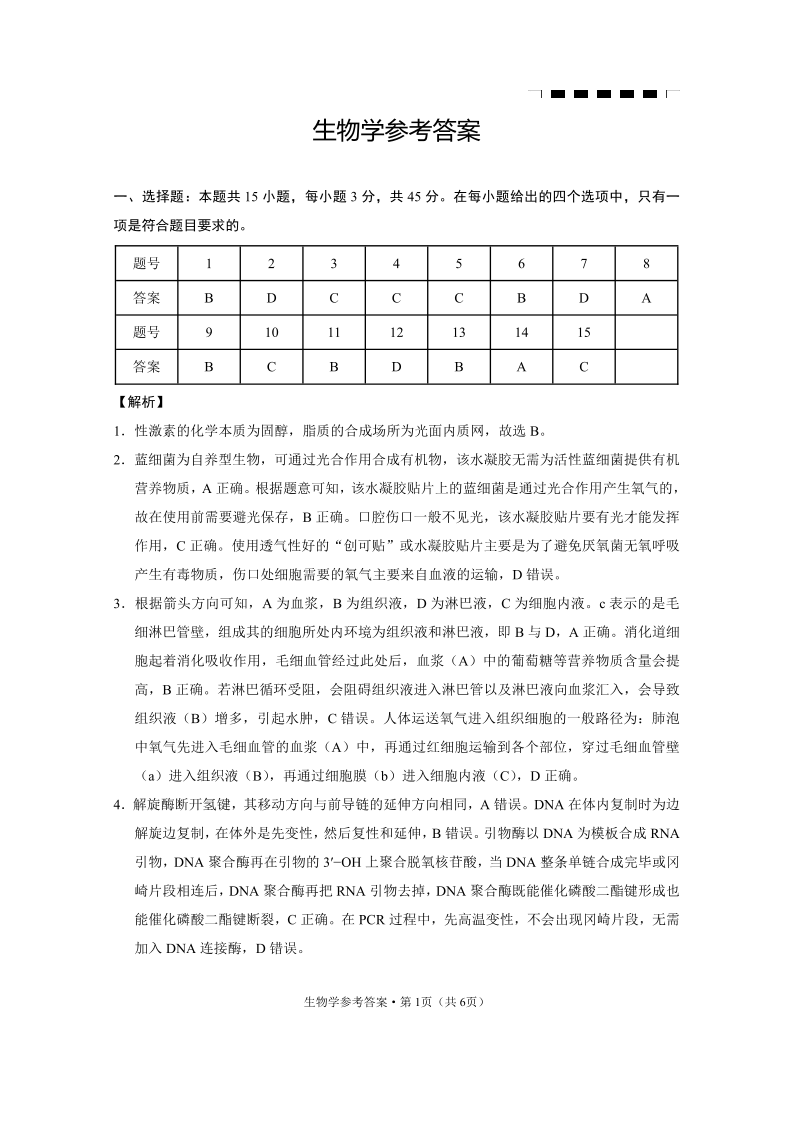 重庆市第八中学2025届高考适应性月考卷(二)生物答案