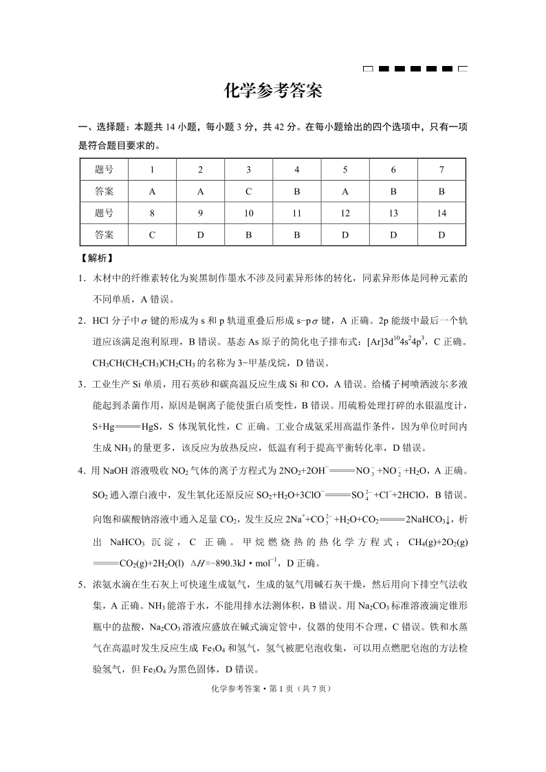 重庆市第八中学2025届高考适应性月考卷(二)化学答案
