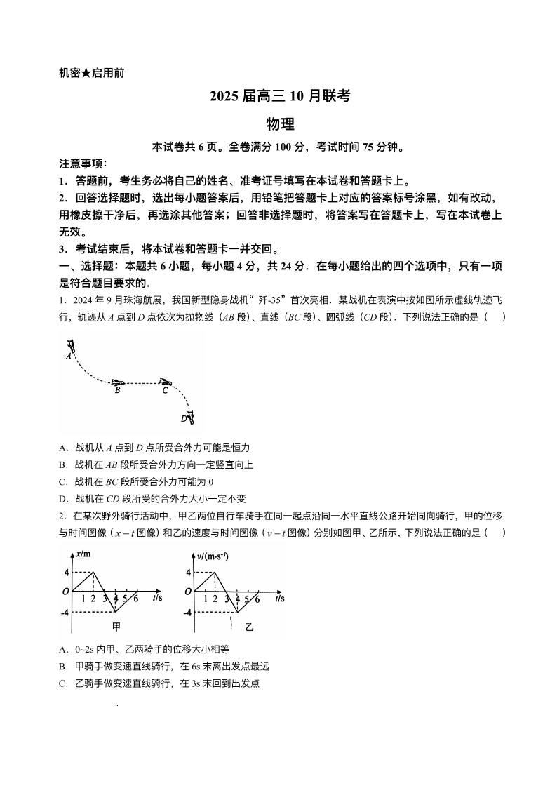 湖南省天壹名校联盟2025届高三10月联考 物理(含答案)