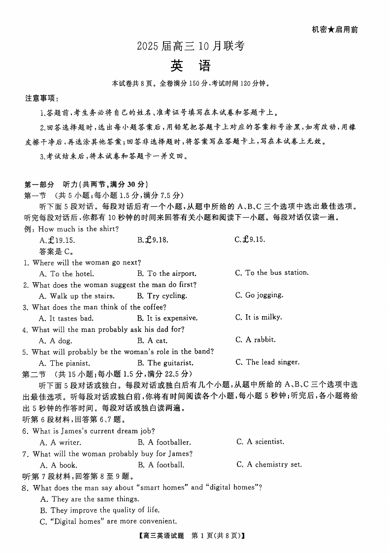 湖南省天壹名校联盟2025届高三10月联考 英语